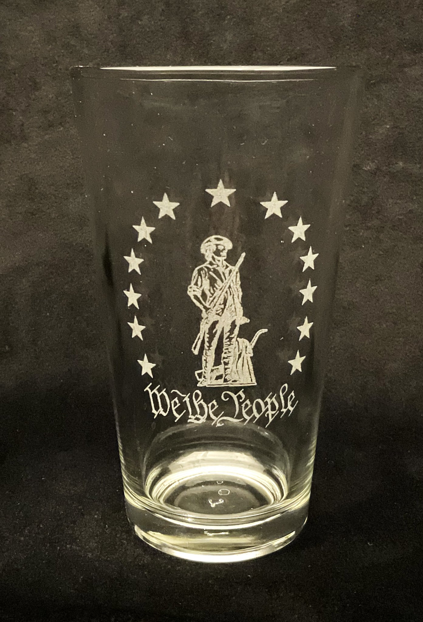 Patriot Collection "We the People" pint glass. Engraved with thirteen stars (representing the original 13 colonies) surrounding the iconic Minuteman image with 'We the People.'
